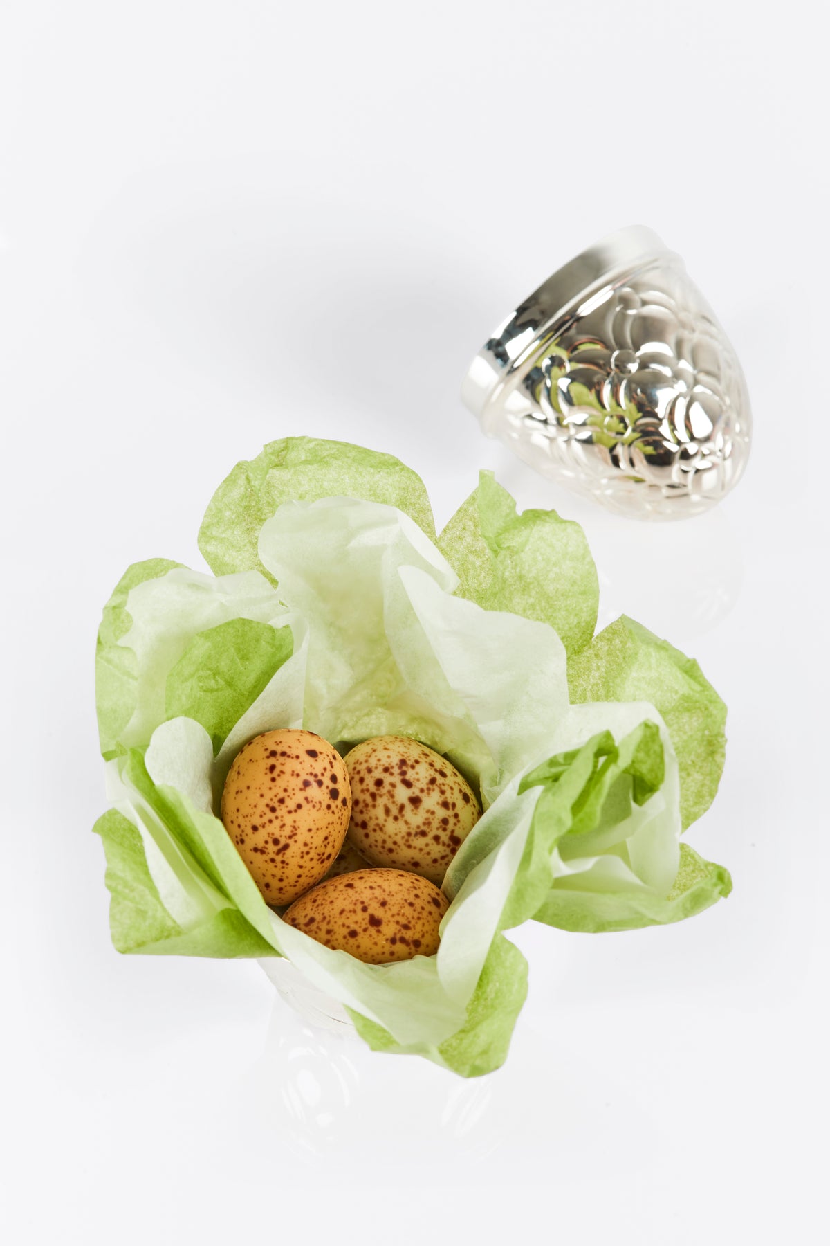 Silver Egg - Miniature Netto: 42 g Økologiske blandede fyldte chokolader / Organic mixed filled chocolates / Gemischte Bio Pralinen. * = Økologisk / Organic / Bio - Kan indeholde spor af æg og nødder / May contain traces of egg and nuts / Kann Spuren von Ei und Nüssen enthalten. DK/SE/NO INGREDIENSER: *sukker, *kakaosmør (23%), *mælk/mjölkpulver (13%), *invertsukkersirup, *hasselnødder, *kakaomasse (5%), *glukosesirup, *smør, vand, emulgator (*sojalecitin), *vanilje, Maldon Havsalt, *blodappelsinolie, *orangeblomstvand, Læsø Sydesalt